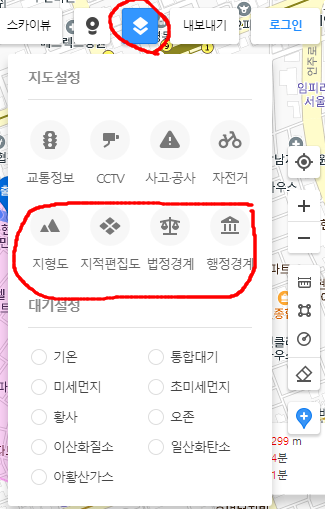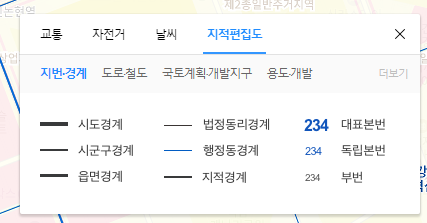 부동산 이야기를 해서 그런데 다음지도 바로가기를 이용하면 "지적편집도"를 살펴보실 수 있습니다. 이거 진짜 대박인 기능인데요. 어디에서 어디까지가 일반주거지역인지 상업지역인지 파악이 가능하므로 매우 유용하죠. 그 외에도 법정경계, 행정경계등 세부적으로 살펴볼 수 있는 것 까지 제공을 해주니 다음지도가 얼마나 대단한지 실감이 나는거같습니다.