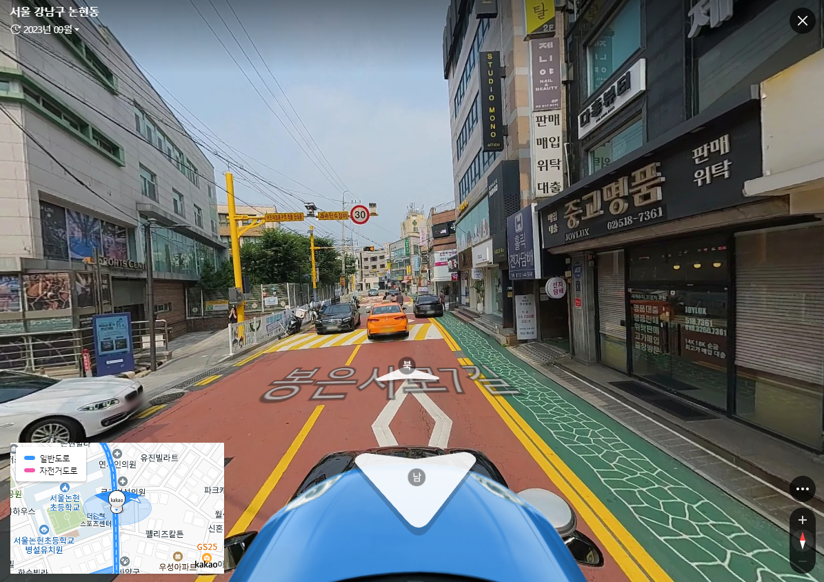 또 다음지도만의 재미난 기능은 바로 로드뷰입니다. 로드가 길이잖아요? 큰길이든 골목길이든 오솔길이든 간에 다음지도를 만드시는 분들이 차량이나 오토바이등을 타고 골목골목을 누비며 전부 사진을 찍어놨습니다. 정말 대단하지 않나요? 스카이뷰 바로 옆에 로드뷰라는 글자를 클릭해보세요. 그리고 길위에 커서를 갖다대면 CCTV 같이 생긴 아이콘이 생기는데요 그대로 "클릭"을 해보세요. 그러면 신기하게도 그 길의 모습을 확인할 수 있답니다.