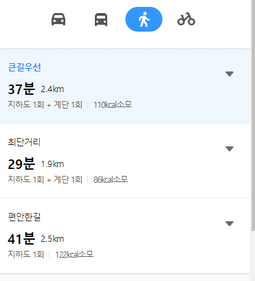 다음지도 바로가기만의 스페셜한 기능이 바로 이것이죠. 자동차 아이콘을 클릭했다면 자가용, 버스를 클릭했다면 대중교통입니다. 지도에 경로를 표시해주고 왼쪽에는 소요시간을 알려주는데요. 다음지도에 따르면 자가용의 경우 9분, 대중교통의 경우 19분이네요. 사람 아이콘을 클릭하면 도보로 가는 방법을 알려주는데 무려 29분~41분이 걸립니다. 큰길 우선, 최단거리, 편안한 길 등 안전한 도로를 추천해주기도 하네요. 칼로리 소모도 알려주는게 다음지도만의 특징입니다. 가장놀라운점은 자전거로 가면 제일 빠르네요. 역시 자전거가 짱입니다.