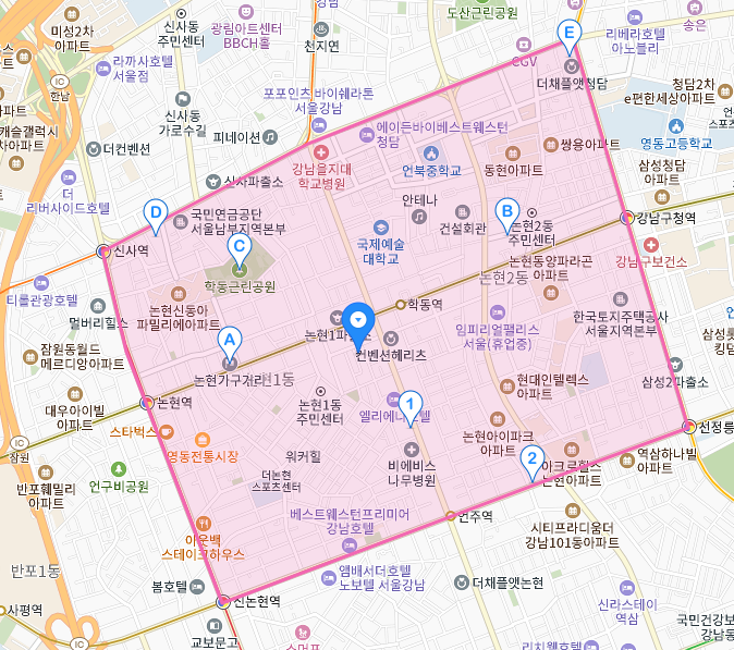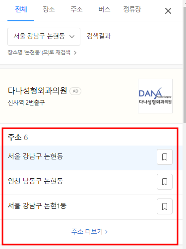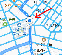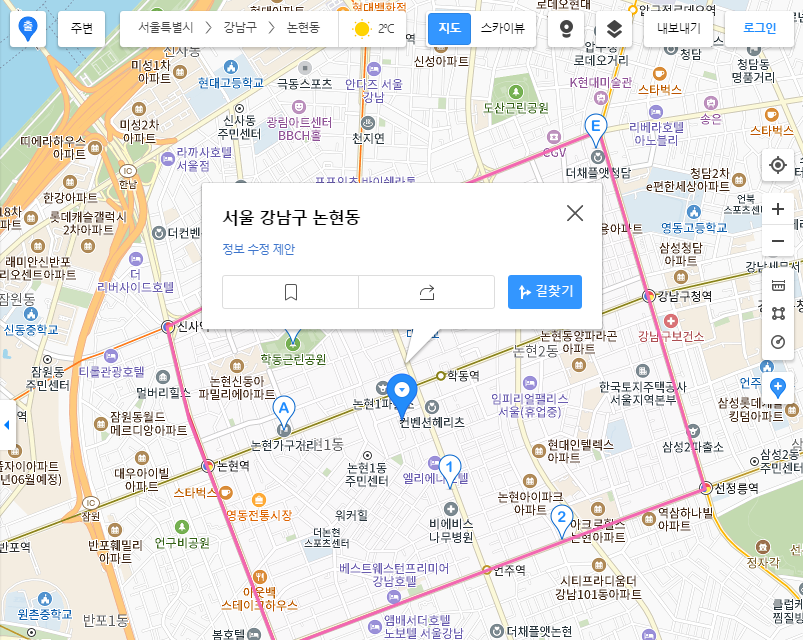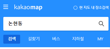 먼저 다음지도를 키셨다면 가장 왼쪽에 보이는 빈칸에 "장소, 주소, 버스 검색" 이라는 글자가 적혀있습니다. 저기에 본인이 찾고자 하는 목적지나 검색어를 입력해보면 됩니다. 예시를 들어서 논현동을 치게 되면 우측의 이미지에 지도가 나타나게 됩니다. 논현동이 빨간색 선으로 경계를 지어서 보여지고 있는 모습을 볼 수 있는데요. 다음지도만의 좋은 기능이라고 할수있지요.