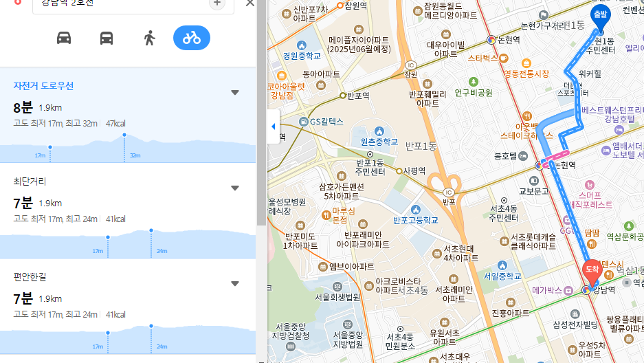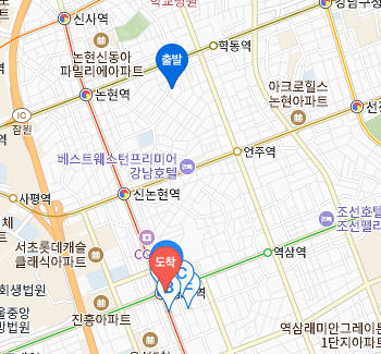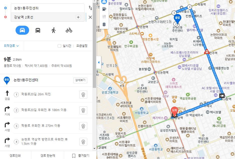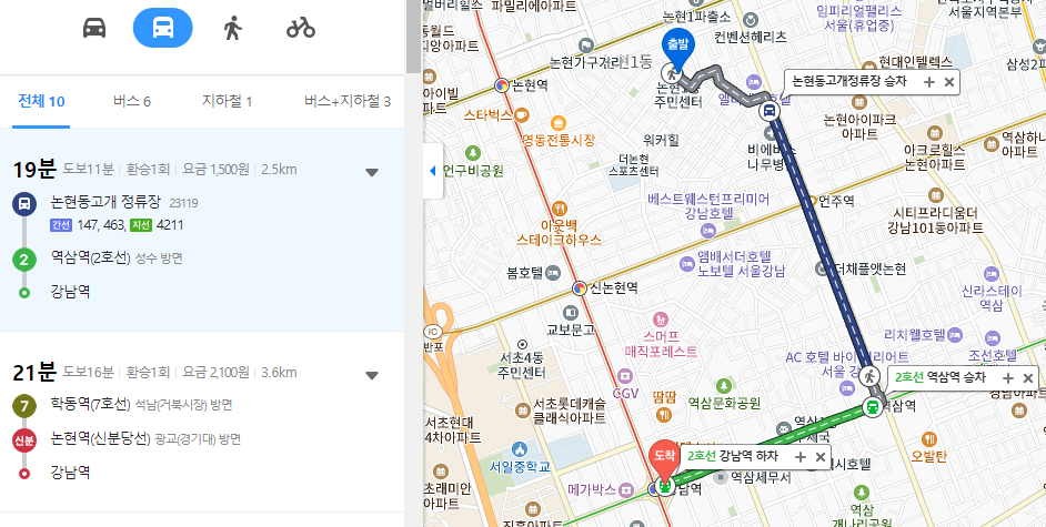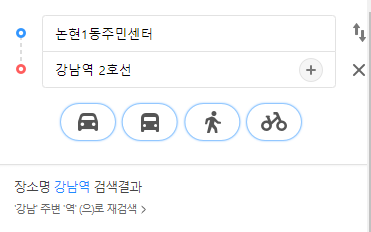 위 칸에 논현1동주민센터를 입력했고 아래칸에 강남역을 입력해보았습니다. 출발지와 도착지를 입력하는 것인데요. 순서를 바꿔 적었다면 오른쪽의 화살표를 통해서 위치를 바꿀 수도 있습니다. 여기서 아래의 자동차, 버스, 사람, 자전거 아이콘을 클릭해보시면 놀라운 기능이 보이는데요.