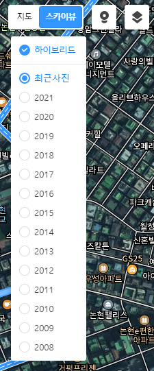 혹시 스카이뷰를 이용해보고싶으시다면 "지도" 말고 "스카이뷰"를 눌러보세요. 그러면 항공 혹은 위성사진으로 찍은 사진들이 나오게됩니다. 특히 다음지도 바로가기는 국내 최초로 위성사진을 제공했던 만큼, 매우 오래전 사진을 데이터로 보유하고 있는데요. 옛날 서울의 모습이 어땠는지 살펴보고 싶다면 스카이뷰를 클릭하여 2008년부터 최근사진까지 차례로 살펴보는 재미도 있습니다. 과거의 역사를 알 수 있다는 점이 참 재미있죠.
