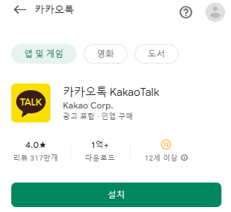 예시를 들어서 한번 설명해보겠습니다. 검색창에 제 경우 카카오톡을 쳐봤는데요. 초록색 버튼으로 "설치" 버튼이 나오지요? 저걸 클릭해서 휴대폰에 어플리케이션을 다운로드 하시면 됩니다. 플레이스토어 다운로드 하는 방법은 굉장히 간단한 편이죠. 혹시라도 구글 아이디 로그인이 되어있지 않으시다면 로그인 버튼을 눌려서 로그인하시고요. 아니면 아이디를 새로 만드셔야 이용이 가능하답니다.