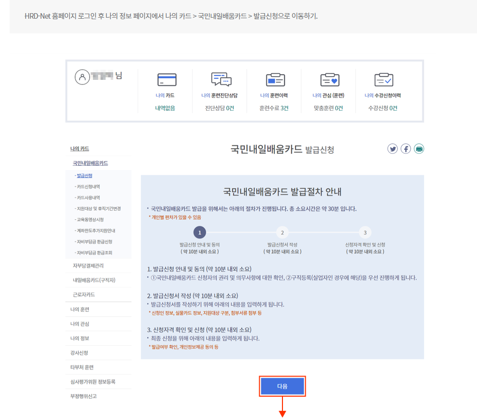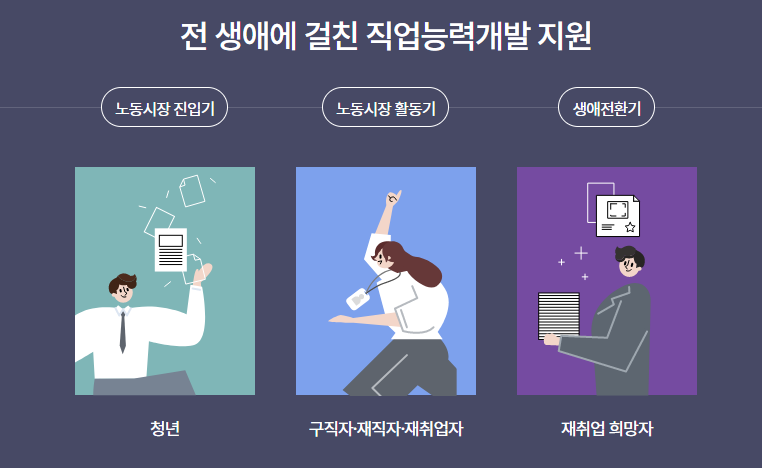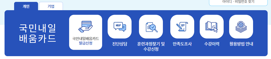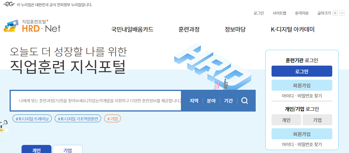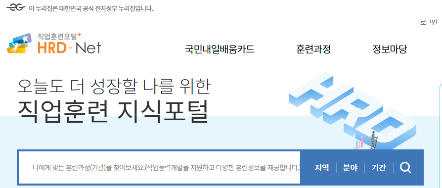 일단은 자격요건이 된다면 www.hrd.go.kr 회원가입 이후에 국민내일배움카드 발급신청을 하여 국비를 지원 받으면서 훈련이나 강의를 받을 수 있어요. 홈페이지 하단의 "훈련과정찾기 및 수강신청"을 눌러보세요