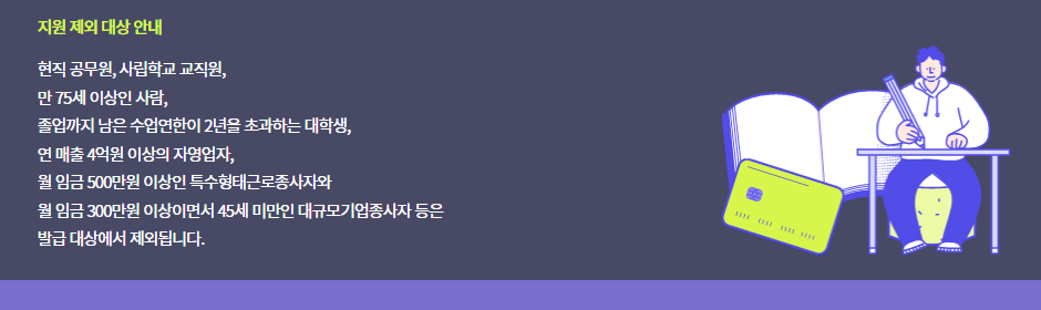 하지만 아까 설명드렸듯이 자신에게 맞는 지원제도가 있는지 부터 살펴보셔야되는데요. 지원 제외 대상을 잘 살펴보셔야 됩니다. 현직 공무원, 사립학교 교직원, 만 75세 이상, 연 매출 4억원 이상의 자영업자, 월 임금 300만원 이상이면서 45세 미만인 대규모기업종사자 등은 국민내일배움카드 발급 대상에서 아예 제외가 되어버려요.