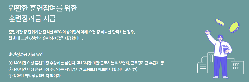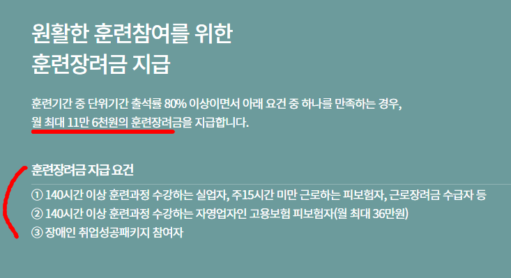 www.hrd.go.kr 회원가입 하신분들은 그래도 대부분 제외대상이 아닌 지원 대상에 속할 것으로 보입니다. 저 또한 얼른 취업을 해야해서 국비지원 강의를 들어보기 위해 이것저것 알아보고 있는데요. 국민취업지원제도 1유형, 2유형을 이용하면 지원금이 80~100%나 되니까 꼭 잘 알아보세요. 훈련 장려금이라는 것도 있어서 140시간 이상 훈련과정 수강하는 실업자등은 월 최대 11만 6천원의 장려금을 지급받을 수 있어요