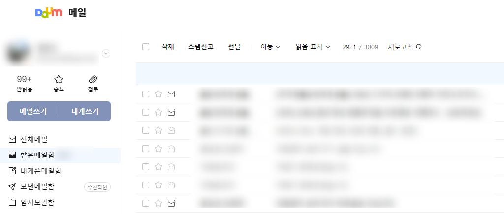 접속을 하셨다면 위 첫번째 사진처럼 메일함이 보이는 화면으로 바로 넘어갈텐데요. 혹시라도 다음에 로그인을 하지 않은 상태라면 로그인을 일단 하셔야 된다는점 유의해주시고요. 혹시라도 본인이 "카카오계정"만 가지고 있다면, 다음메일 서비스 이용을 위해서 Daum 아이디(이메일)을 생성을 해줘야만 합니다. 그래야만 메일함을 생성할 수 있기 때문이죠. 포털이었던 다음의 네임밸류가 있기 때문에 두 회사가 합쳐졌어도 여전히 다음의 기조를 유지하고 있는 듯합니다.