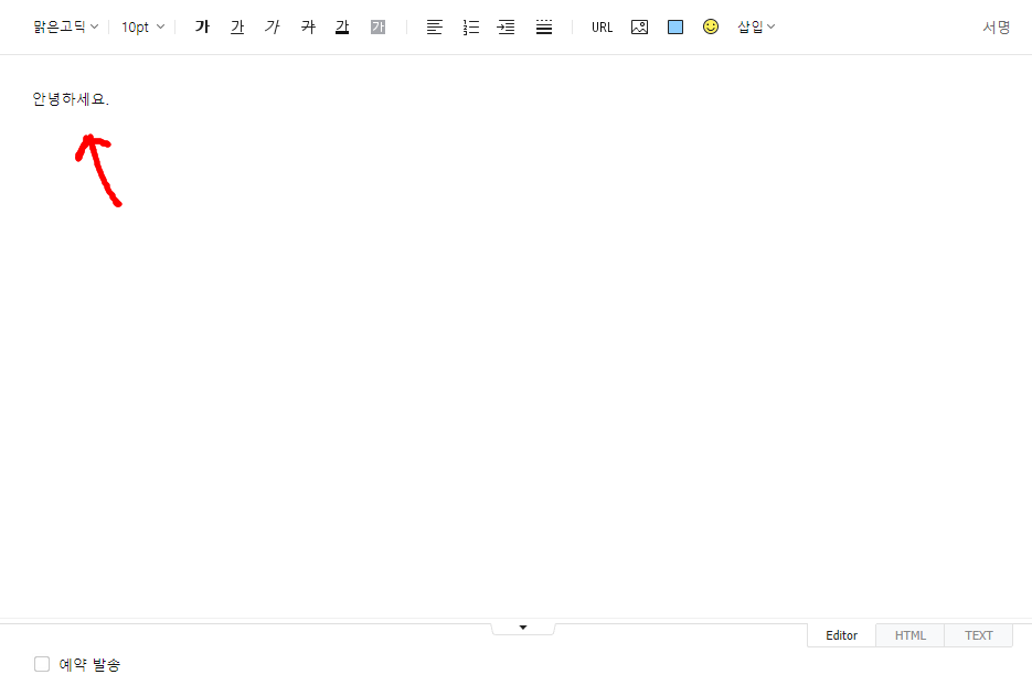 그리고 아래에는 다음메일 바로가기의 내용을 입력하는 부분입니다. 상대방에게 전하고자 하는 말을 입력만 하시면 됩니다. 그리고 위쪽에 "맑은고딕"이라고 되어있는 글자를 클릭하면, 다른 글씨체로 변경도 할 수 있고 오른쪽에 기본적으로 10pt 라고 되어있을텐데, 글자 크기를 변경할수도 있습니다. 그리고 밑에 보시면 "예약 발송"에 체크를 하면 메일을 말그대로 정해진 시간에 예약을 해서 상대방에게 발신할수도 있어요. 좋은 기능이지요.