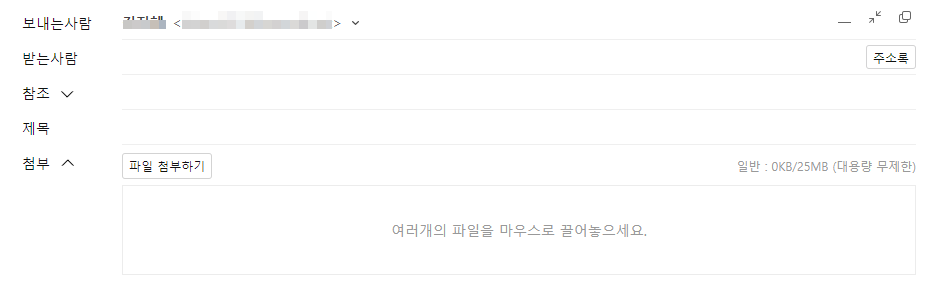 받는사람 란에 상대방의 이메일주소를 입력하세요. 그리고 제목을 쓰세요. 이미지라던가 뭔가 첨부할 엑셀파일 등이 있다면 버튼을 눌러서 추가하시면됩니다.